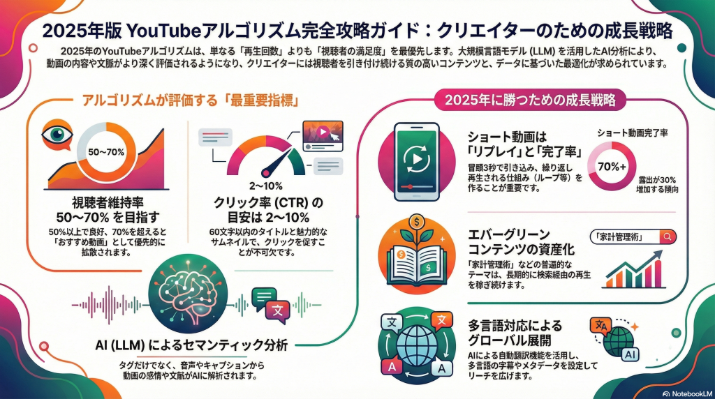 AIが動画の「感情」や「文脈」まで理解するようになった今、クリエイターに求められるのは、アルゴリズムをハックすることではなく、視聴者に対して誠実で質の高いコンテンツを提供することです。 「視聴維持率70%」という具体的な数値目標を意識しつつ、視聴者の時間を奪うのではなく、有意義な時間(Quality Watch Time)を提供することが、最強のアルゴリズム対策となります。